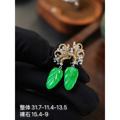 【翡翠耳坠】18k金镶满绿叶子耳坠,设计款,黄钻和白钻的组合很亮眼,吸睛又贵气