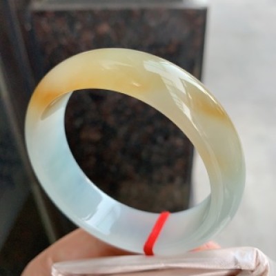 【翡翠手镯】招财镯,58圈口,冰润带黄翡正圈,尺寸:58.2×12.4×9.4mm。